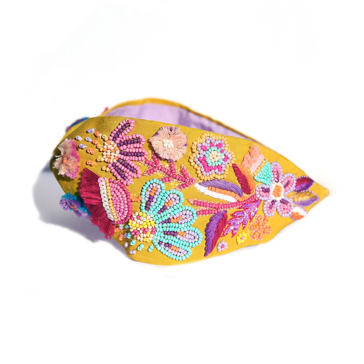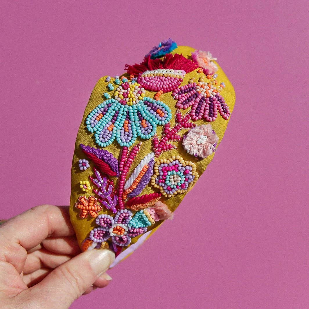 The Mustard Blossom Beaded Headband has been designed by Jemima Kingston in Australia. Exquisite detailing make this hand beaded headband a beautiful statement piece. The design is colourful, detailed and vibrant.